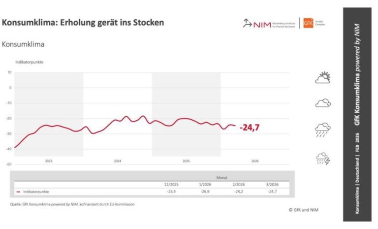 Konsumklima: Erholung gerät ins Stocken 25. Februar 2026 Sparer bleiben vorsichtig – Anschaffungsneigung fällt trotz steigender Einkommen Weiterlesen >
