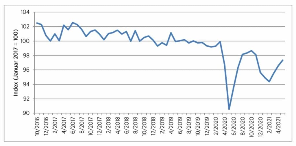 Im Vergleich zum Vormonat steigt die Anschaffungsneigung der Verbraucher und liegt deutlich über dem Niveau aus dem Vorjahresmonat, der jedoch erheblich unter dem Eindruck des ersten Lockdowns im Frühjahr 2020 stand. Gleichzeitig geht die Sparneigung zurück. Spürbare Effekte wird die ausgeprägte Konsumbereitschaft allerdings erst haben, wenn wieder Möglichkeiten zum Konsum in Einzelhandel, Freizeit und Tourismus gegeben sind. Daher ist aktuell weiterhin davon auszugehen, dass der private Konsum voraussichtlich erst gegen Ende des zweiten Quartals oder zum dritten Quartal wachsen kann.
