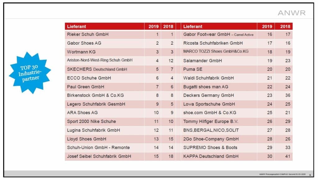 Die ANWR-Schuh hat Ihr Lieferanten-Ranking für 2019 veröffentlicht. Aufsteiger des Jahres war der eigene Großhandel, der von Platz zwölf auf Rang vier sprang. Hier konnte der Umsatz mit den Sportmarken Nike und Adidas sowie der Eigenmarke Longo verdoppelt werden. Auf den ersten drei Plätzen blieb mit Rieker, Gabor und Wortmann alles beim Alten. Dahinter verbesserte sich Skechers auf Platz fünf.