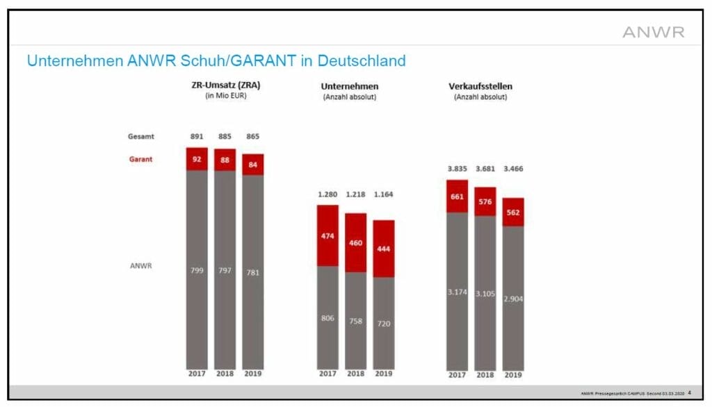 Der ZR-Umsatz der ANWR Schuh und der Garant in Deutschland ist 2019 um rund zwei Prozent auf 865 Millionen Euro zurückgegangen. Die Zahl der Unternehmen reduzierte sich um 52 auf 1164, die der Verkaufsstellen um 215 auf 3466. Die Fachhändler konnten ihren Umsatz 2019 durchschnittlich um 2,7 Prozent steigern. Dass das Plus nicht noch höher war, war dem schwachen Dezember geschuldet. „Das Jahresende war ein Desaster“, sagte ANWR-Geschäftsführer Fritz Terbuyken. Händler mit Online-Handel schnitten im vergangenen Jahr mit +4,3 Prozent besser ab als rein stationäre Händler mit +2,0 Prozent.