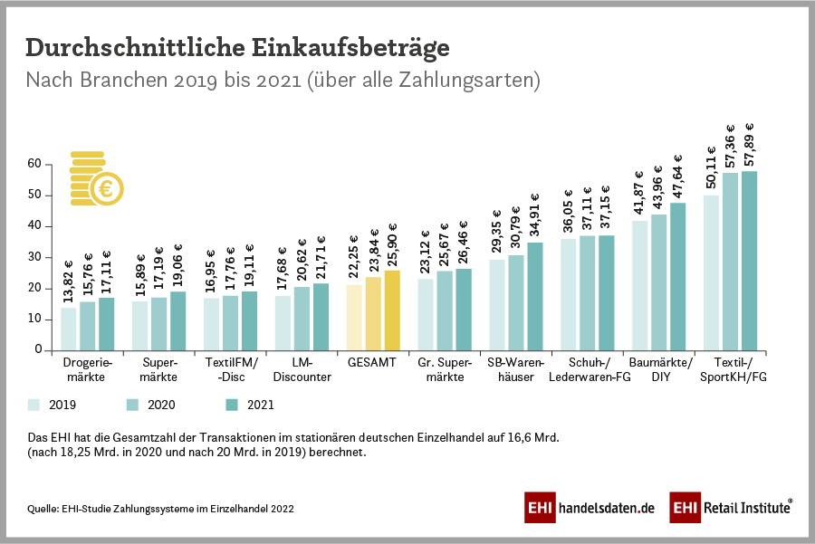 Gestiegen ist dagegen der durchschnittliche Einkaufsbetrag im deutschen Einzelhandel. Der Durchschnittsbon lag 2021 bei 25,90 Euro (Vorjahr: 23,84 Euro) und hat sich damit innerhalb von zwei Jahren um 16 Prozent erhöht, während der gesamte stationäre Umsatz 2021 von 435 Milliarden Euro auf 430 Milliarden Euro geschrumpft ist. Aufgrund der Kontaktbeschränkungen ging der Trend dahin, den Handel deutlich weniger aufzusuchen, dann aber erheblich mehr einzukaufen und gleichzeitig einen wesentlichen Anteil der Einkäufe außerhalb des täglichen Bedarfs online zu tätigen. Dies hat die Zahl der Einkäufe binnen zwei Jahren von 20 Milliarden auf 16,6 Milliarden schrumpfen lassen. Gleichzeitig ist nach ersten Berechnungen des EHI der Online-Umsatz (brutto) in diesen zwei Jahren von rund 60 Milliarden Euro auf mindestens 100 Milliarden Euro gestiegen.