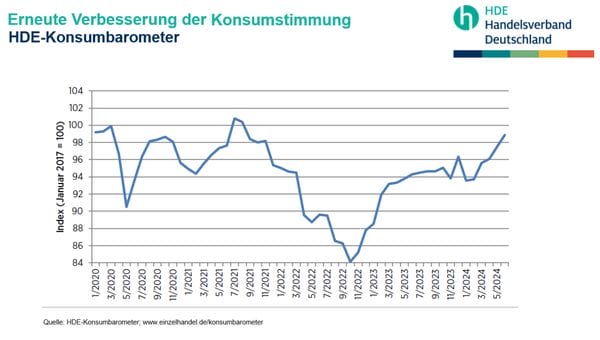Wie das aktuelle Konsumbarometer des Handelsverbandes Deutschland (HDE) zeigt, reißt der monatelange Aufwärtstrend der Verbraucherstimmung auch im Juni nicht ab. Der Index steigt bereits zum fünften Mal in Folge und klettert damit auf den höchsten Stand seit August 2021. Dass es mit der Konsumstimmung bergauf geht, deutet auf eine mittelfristige Erholung des privaten Konsums hin.