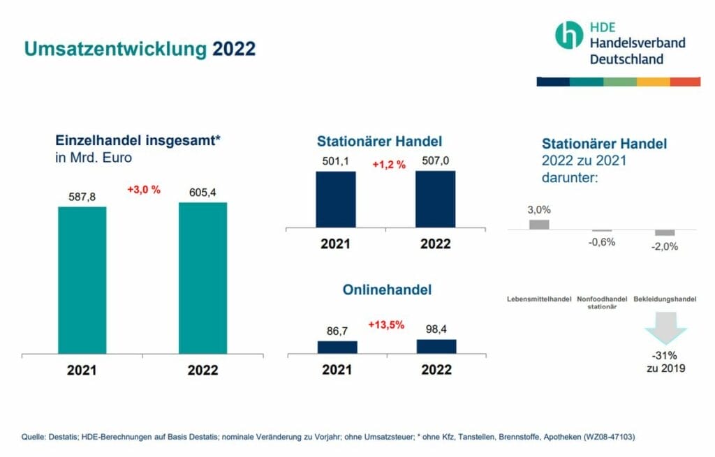 Wenn die Auswirkungen der Pandemie zeitnah nachlassen und Maßnahmen wie 2G für den Handel zurückgenommen werden, rechnet der HDE für die Branche trotz aller Probleme insgesamt mit einem Umsatzplus von drei Prozent. Das Gros des Wachstums dürfte allerdings erneut aus dem Online-Bereich kommen, der mit 13,5 Prozent Umsatzplus im Vergleich zum Vorjahr rechnen darf. Insgesamt werden sich die Umsätze im Einzelhandel inklusive des Online-Handels 2022 damit auf mehr als 600 Milliarden Euro belaufen.