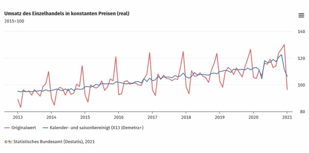 „Nie zuvor gab es derart auseinanderlaufende Entwicklungen im Einzelhandel. Der Lockdown treibt die Umsätze im Online-Handel nach oben und stürzt vor allem den stationären Modehandel in ein tiefes Tal der Tränen“, so HDE-Hauptgeschäftsführer Stefan Genth. Die Daten des Statistischen Bundesamtes machen deutlich, dass der Online-Handel im Januar im Vergleich zum Vorjahresmonat seine Umsätze um ein Drittel (31,7 Prozent) steigern konnte. Im gleichen Zeitraum verlor der Modehandel drei Viertel (76,6 Prozent) seiner Erlöse. Der Einzelhandel insgesamt erlebte im Januar mit einem Minus von 8,7 Prozent gegenüber dem Vorjahr den stärksten Umsatzrückgang seit Beginn der Coronakrise.