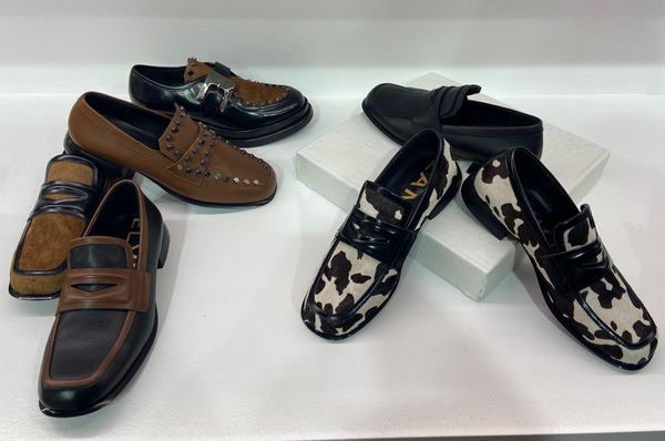 Das könnten neben den obligatorischen Sneakern sportlich-elegante Stiefeletten, Langschäfter und maskulin inspirierte Halbschuhe mit dickeren, mehrschichtigen, markanten Böden sein. Auch „kernige“ Ballerinas mit Deko wie Nieten, Ösen und Riemen gefallen. Rot- und Brauntöne sind in Mailand gesetzt: Das Spektrum reicht von Burgundy und Kastanie bis hin zu Zigarre und dunklem Testa di Moro. Schwarz ist unverzichtbar. Beim Thema Animal Prints erobern Kühe, Kroko und Schlangen das modische Terrain.