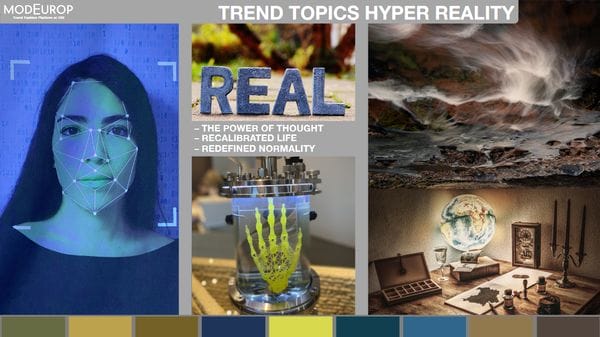 Realitätsnah, geerdet und gleichzeitig progressiv präsentiert sich die Thematik „HYPER REALITY“. In diesem Farbszenario verschmilzt die Realität mit der virtuellen Welt. Funktionalität und Workwear-Elemente treffen auf Vintage-Effekte. Brush- und Two-Tone-Effekte sind wieder angesagt. Spannende Kontraste auch bei den Farben: Gepflegte Brauntöne verbinden sich mit leuchtenden Blau- und Gelbnuancen. Frische Olivtöne runden das Spektrum ab.