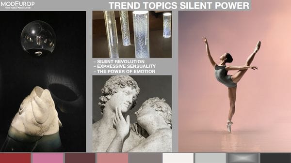 Minimalismus und Normalität, aber bitte immer mit leichtem Twist, sind die Ideengeber des Farbthemas „SILENT POWER“. Feminine Eleganz wird durch Asymmetrien und ausbalancierte Konstruktionen weitergedreht. Klassik auch bei Schuhen und Taschen, die durch dekorative Details einen innovativen Look erhalten. Die Farbwelt inszeniert eine kraftvolle Stringenz. Die Neutralität von Schwarz und Weiß wird von Graunuancen flankiert. Tiefe Rottöne, feminines Pink und Apricot bauen die Brücke von neutral zu farbig. Bewegte Oberflächen und Metallics werden wichtig.