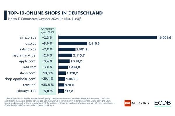 An der Spitze bleibt amazon.de (15,0 Mrd. Euro) vor otto.de (4,4 Mrd. Euro) und zalando.de (2,6 Mrd. Euro). International aufstrebend zeigt sich shein.com, das erstmals mit 1,1 Milliarden Euro Platz sieben erreicht. Mit dem stärksten relativen Wachstum von 33,5 Prozent schafft auch rewe.de (920 Mio. Euro) den Sprung in die Top 10, dicht gefolgt von shop-apotheke.com (29,1 Prozent Wachstum). „Neben etablierten Playern gewinnen zunehmend Anbieter des täglichen Bedarfs an Bedeutung“, kommentiert E-Commerce-Experte Lars Hofacker vom EHI. „Veränderte Einkaufsgewohnheiten – etwa Online-Lebensmittelbestellungen und E-Rezepte – treiben diese Entwicklung.“