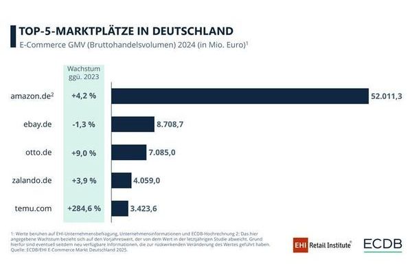 Bei den führenden B2C-Marktplätzen behaupten amazon.de, ebay.de und otto.de ihre Positionen, wobei otto.de mit einem Bruttohandelsvolumen von +9 Prozent besonders zulegt. Den größten Sprung macht temu.com, das mit 3,4 Milliarden Euro GMV neu in die Top 5 einzieht und ein Wachstum von 285 Prozent erzielt. „Temu zeigt, wie schnell neue internationale Anbieter die Marktstruktur verändern und etablierte Plattformen herausfordern“, sagt Lars Hofacker.