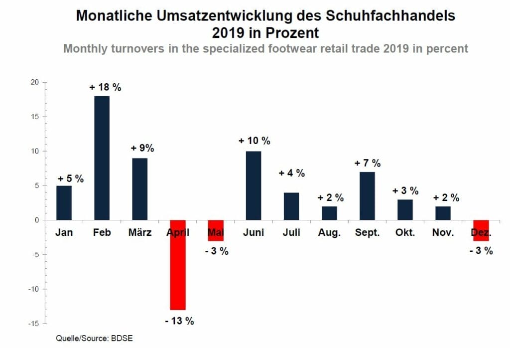 Der Schuheinzelhandel ist mit leichten Umsatzrückgängen in das Jahr 2020 gestartet. Dies lag maßgeblich an den hohen Vorjahreswerten aus 2019. Zudem waren die letzten beiden Monate dieses Jahres vielerorts zu mild, was den Abverkauf gefütterter Schuhe nicht gerade befördert hat. Ob und inwieweit sich in der aktuellen Umsatzentwicklung bereits eine gewisse Konsumzurückhaltung aufgrund des Coronavirus niederschlägt, lässt sich schwer beurteilen.