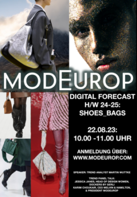 Modeurop-Webinar zu den Trends Spring/Summer 2024 13. Februar 2023 Schuhe und Taschen stehen am 15. Februar im Fokus Weiterlesen >
