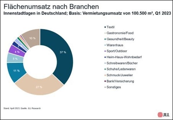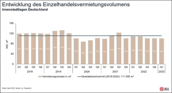 Der deutsche Einzelhandelsvermietungsmarkt hat zum Jahresauftakt 100.500 Quadratmeter neuangemietete Ladenfläche verzeichnet. Damit hat sich das erste Quartal wie bereits seine beiden Vorgänger über der wichtigen Schwelle von 100.000 Quadratmeter behauptet. Zu diesem Ergebnis kommt das Immobilienberatungsunternehmen JLL. Der Mittelwert der vergangenen fünf Jahre von 111.000 Quadratmeter wurde hingegen erneut unterschritten, die Anzahl der Abschlüsse ging in Relation zum Vorjahresvergleichsquartal von 213 auf 192 zurück. Vor allem der Textilhandel zeigt sich mit 37 Prozent Anteil am Flächenumsatz vergleichsweise expansionsfreudig.